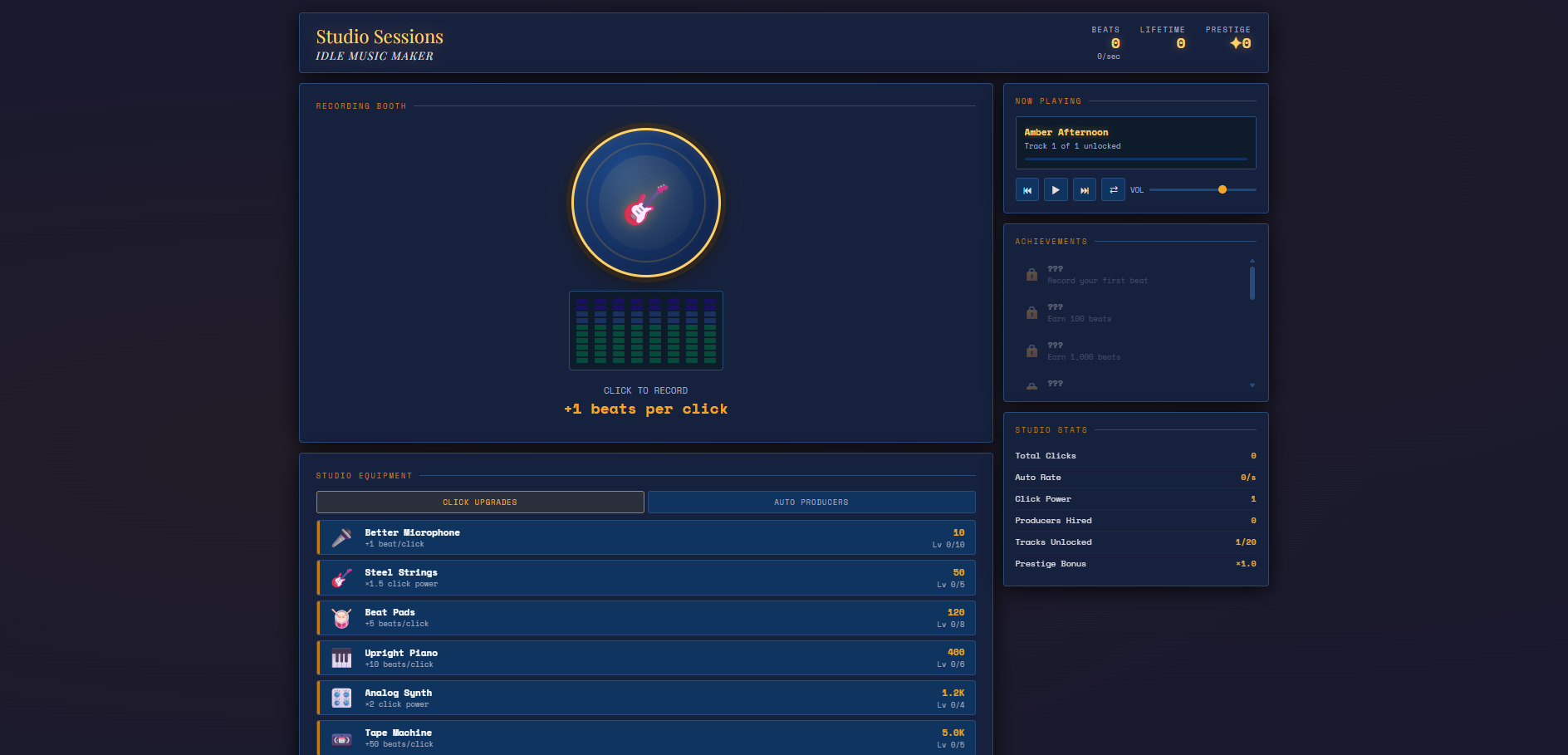 Once you've earned 1,000,000 lifetime beats, the โ Go Gold — Prestige Reset button appears. Pressing it resets everything — beats, upgrades, producers, and unlocked tracks — back to zero. In exchange, you receive a permanent ร0.5 bonus added to your multiplier (so ร1 โ ร1.5 โ ร2 โ ร2.5, etc.).
